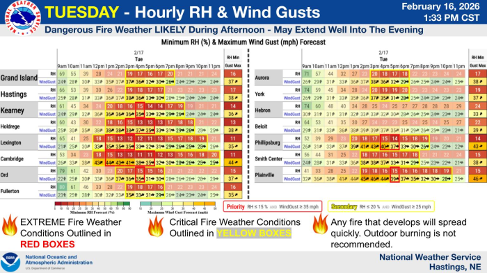 Weather Story Red Flag Warning in effect Tuesday (12PM-8PM) Hourly Max Wind Gusts and Min RH on Tuesday