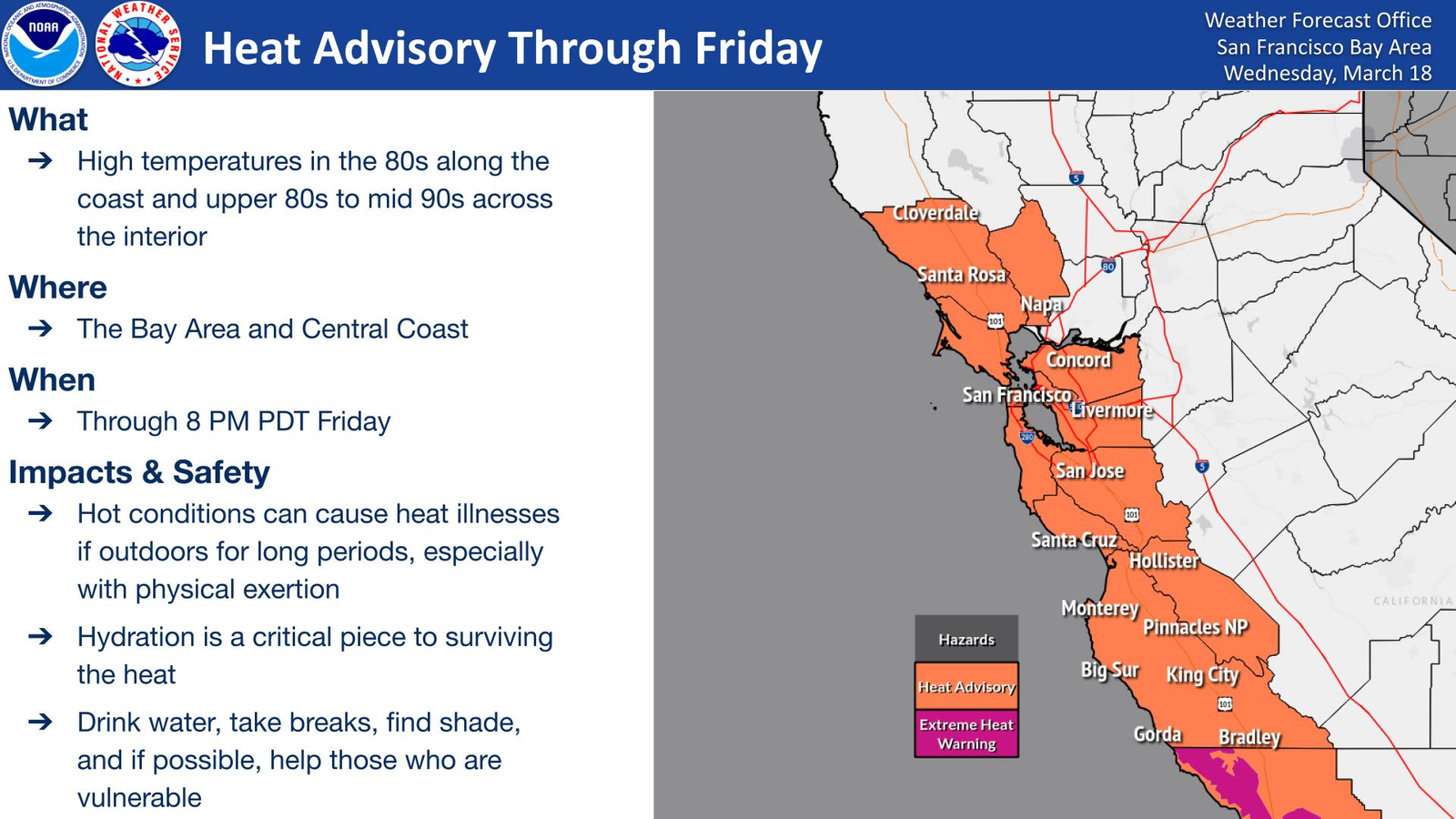 Much above normal temperatures in the 80s near the coast and upper 80s to mid 90s across the interior are expected this week across the Bay Area and Central Coast. Portions of the interior Central Coast may reach the upper 90s starting mid to late week. Overnight lows in the upper 50s to low 60s will offer some relief to the lower elevations but will offer minimal relief within the higher elevations. Conditions will be much above normal along the coast next week but coastal residents may experience more relief overnight than those across the interior. The risk of heat related illnesses will increase with each additional day of heating from this event.