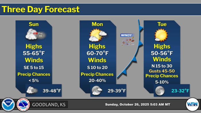 Morning fog will linger shortly after sunrise today, before visibilities improve across the area. Winds will shift to the southeast today as an area of low pressure develops over the Rockies in advance of an approaching storm system. A cold front will sweep across the region Monday night, bringing colder temperatures, strong northerly winds and scattered rain showers. Strong northerly winds, potentially gusting as high as 50 mph will continue on Tuesday.