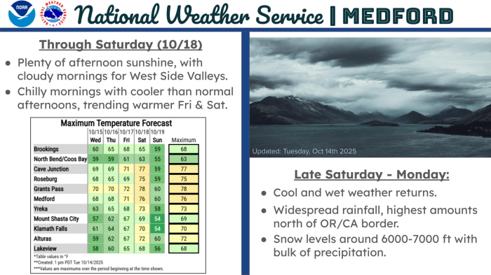 Plenty of afternoon sunshine is in store for this week, though with cloudy mornings to start in West Side Valleys. Mornings will be on the chilly side as well with afternoon temperatures hovering a few degrees below normal through Thursday. Afternoon temperatures trend warmer for Friday and Saturday. Cool and wet weather returns late Saturday into Monday with the next front expected to move onshore late Saturday night. Another round of widespread rainfall is expected, with the highest amounts expected north of the OR/CA border. Snow levels will hover around 6000-7000 ft with the bulk of the precipitation, so wintry impacts will be limited.