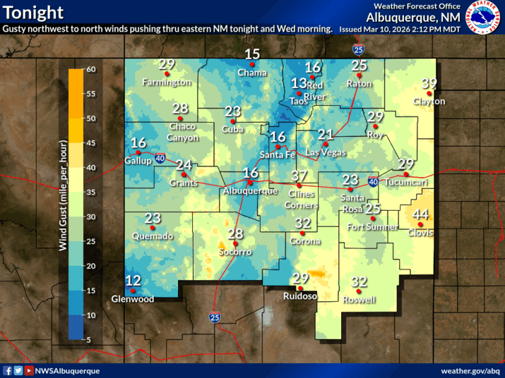 Gusty northwesterly then northerly winds swing thru eastern NM tonight into Wednesday morning. Peak gusts will reach 30-40mph, topping out near 45 mph over the Caprock from Clovis to Portales.