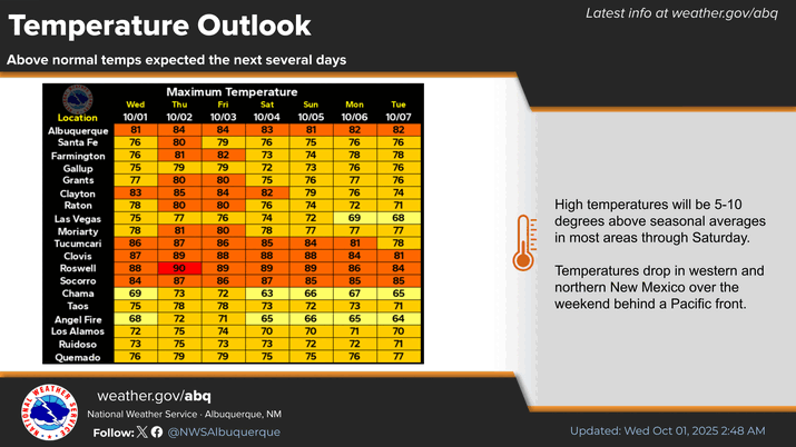 High temperatures will generally be a few to 10 degrees above seasonal averages over the next 7 days.