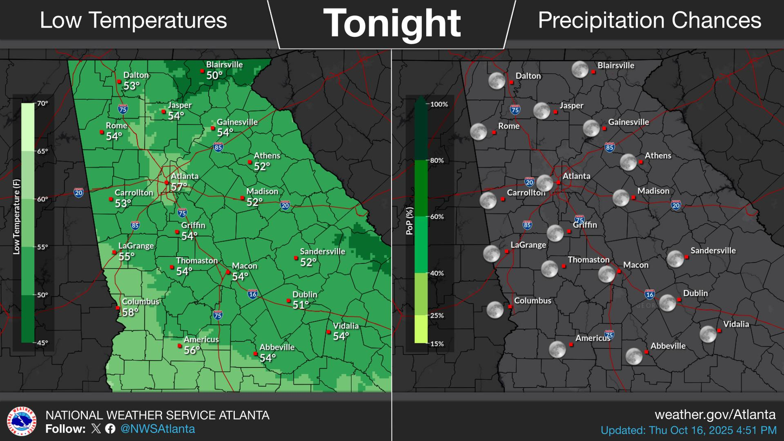 Low temperatures and rain chances for tonight across north and central Georgia.