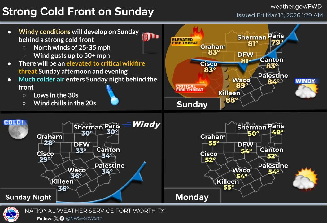 Strong north winds of 25 to 35 MPH, along with gusts to 50+ mph, are expected Sunday afternoon and evening behind the next cold front. An elevated to critical wildfire threat will also develop both ahead of and behind the front. Unseasonably cold weather will follow Sunday night, with low temperatures in the 30s along with wind chills in the 20s.