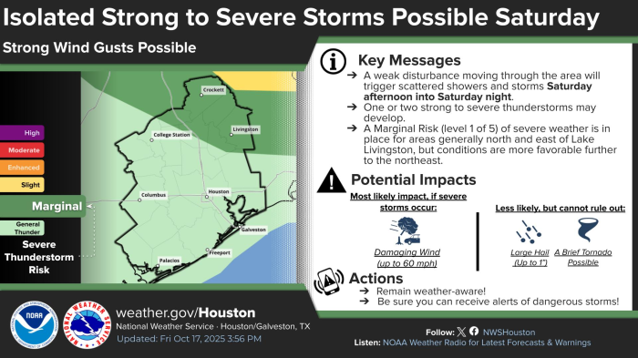 Isolated strong to severe storms are possible Saturday afternoon into Saturday night due to a passing weak disturbance. A Marginal Risk (Level 1 of 5) for severe weather is in place for areas generally north and east of Lake Livingston. Potential impacts include damaging wind gusts (up to 60 mph), with a lower chance of large hail or a brief tornado. Remain weather-aware!