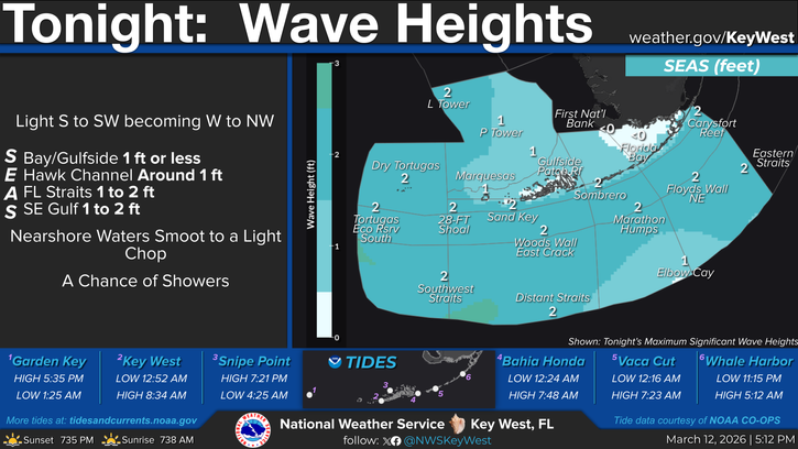 Bay/Gulfside Seas 1 ft or less, Hawk Channel Seas Around 1 ft, FL Straits Seas 1 to 2 ft, SE Gulf Seas 1 to 2 ft.