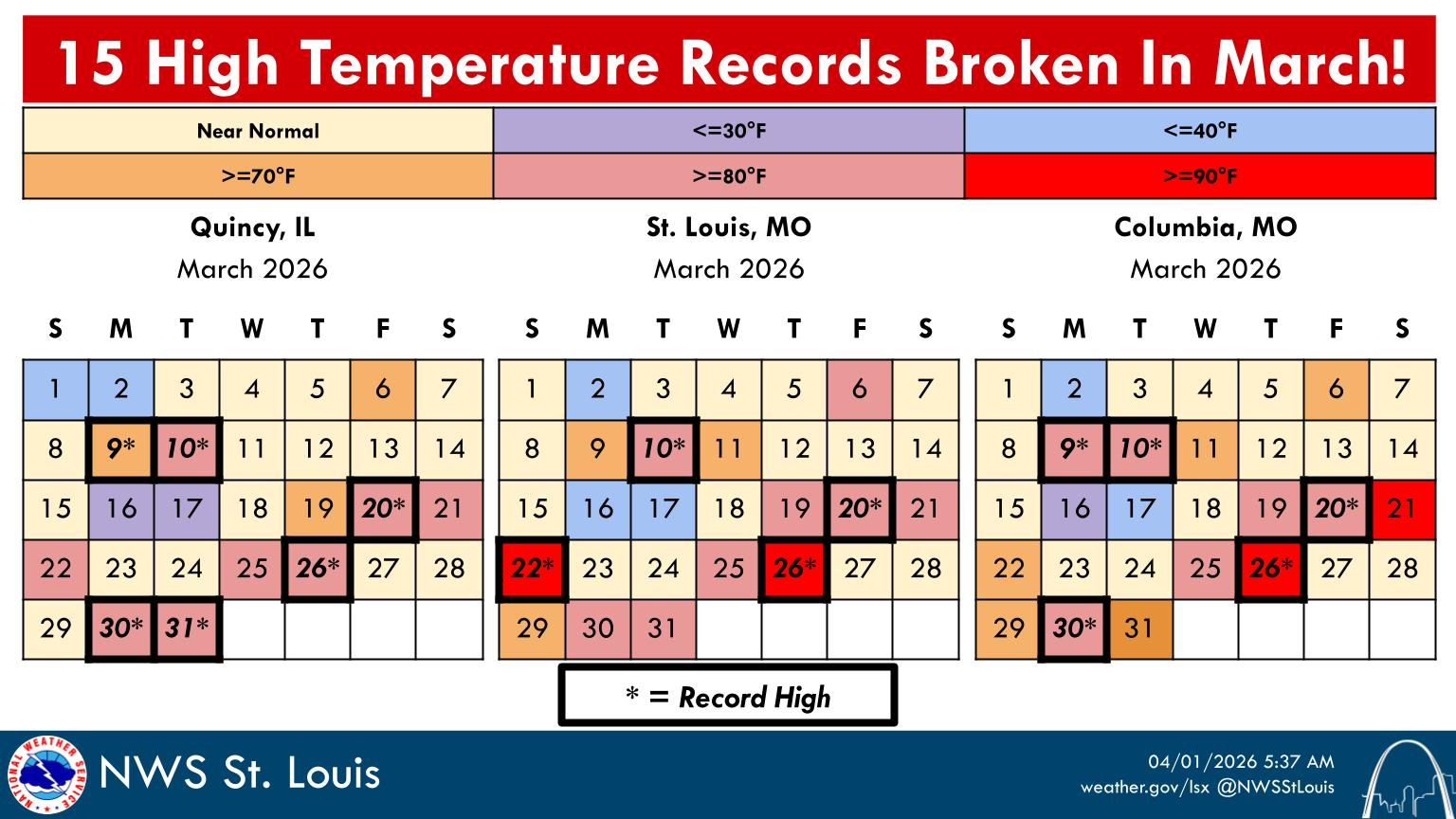 With March officially in the rearview mirror, we can now say that it was one for the record books! 15 high temperature records fell at our long-term climate sites in the region, with Quincy, IL setting the most of the three sites (6 records). Despite a few very chilly days, this March ranks as one of the warmest on record.