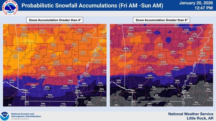 The potential for a winter storm to affect Arkansas is increasing between Friday and Sunday. Currently, there is a 40-60% chance of exceeding 4" and 30-50% chance of exceeding 6" of snow over central and northern Arkansas. At this time lower amounts are expected over southern Arkansas due a mixture of freezing rain, sleet, and snow.