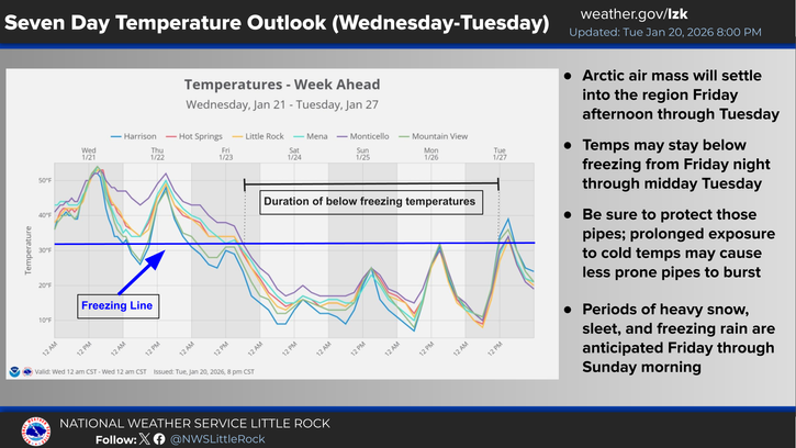 Very cold air is anticipated to move into Arkansas over the weekend as arctic high pressure settles into the region. With the expected snowpack across Arkansas, temperatures will struggle to break the freezing mark by Tuesday. Wind chills will make conditions feel even colder during the period.